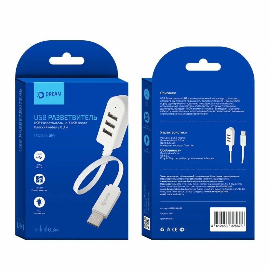 Разветвитель USB (Hub) DREAM (UM1), 3 порта USB 2.0 (0,3м) информация: