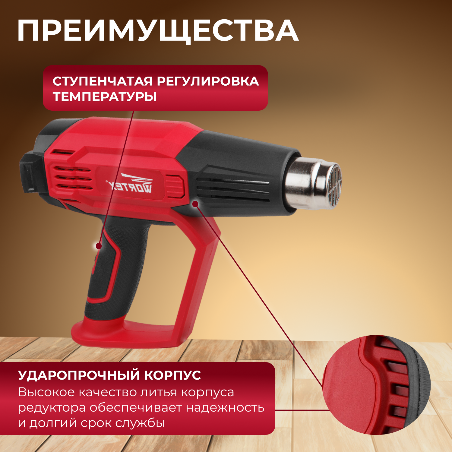 Отзывы на Термовоздуходувка WORTEX HG 6222 в кор. + набор сопл 2000 Вт, 3 скор., 90-600 °С (плавн. рег., 250-500 л/мин) (HG622200011)