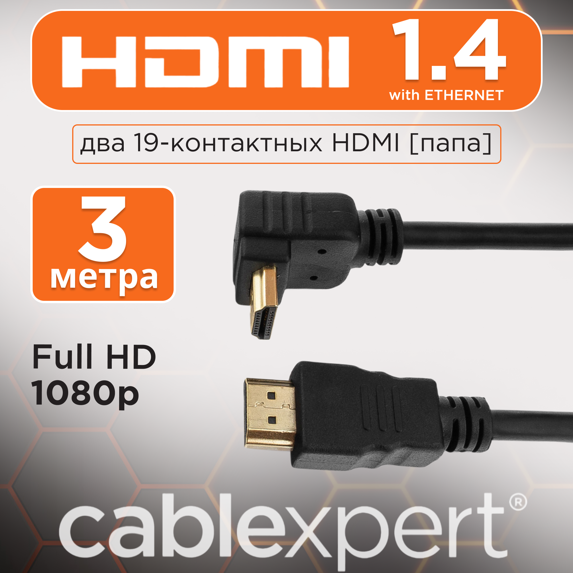 Кабель HDMI Cablexpert, HDMI(m)-HDMI(m), вер.1.4, 3 м, 19M/19M, угловой, черный