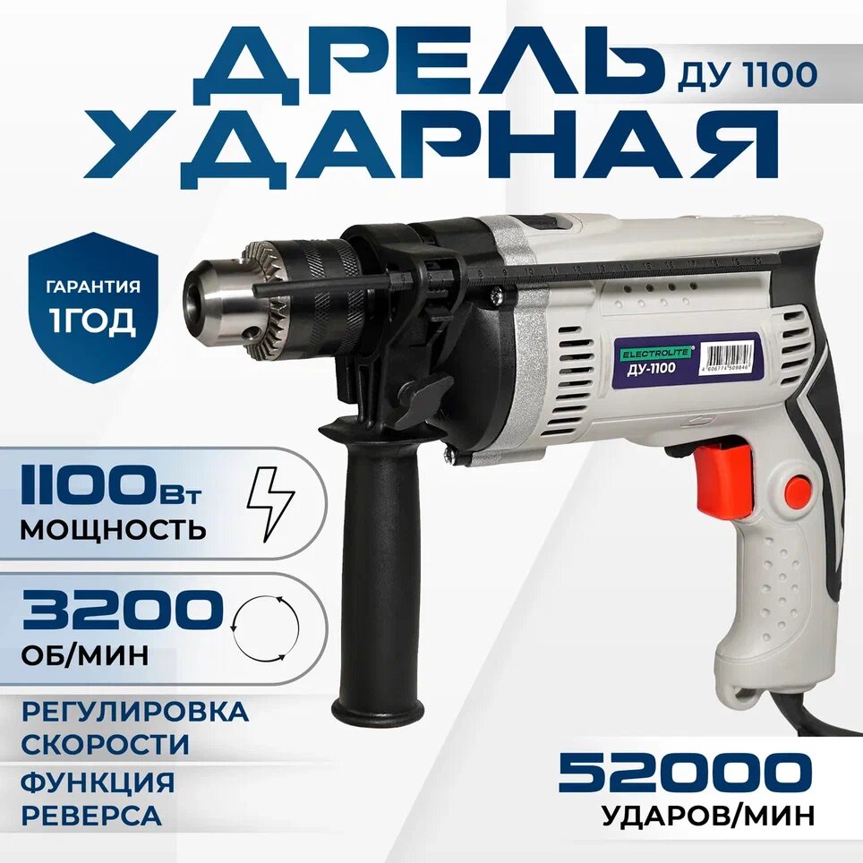 Дрель ударная электрическая ELECTROLITE ДУ 1100 (1100 Вт, регулировка оборотов, 52000 уд/мин) для сверления металла бетона и дерева информация: