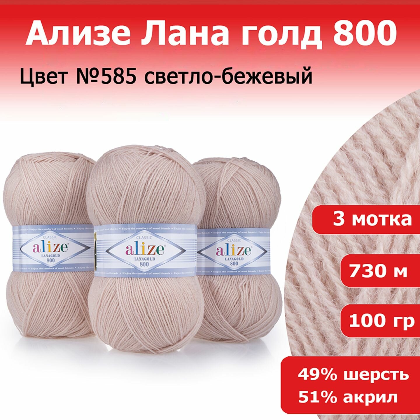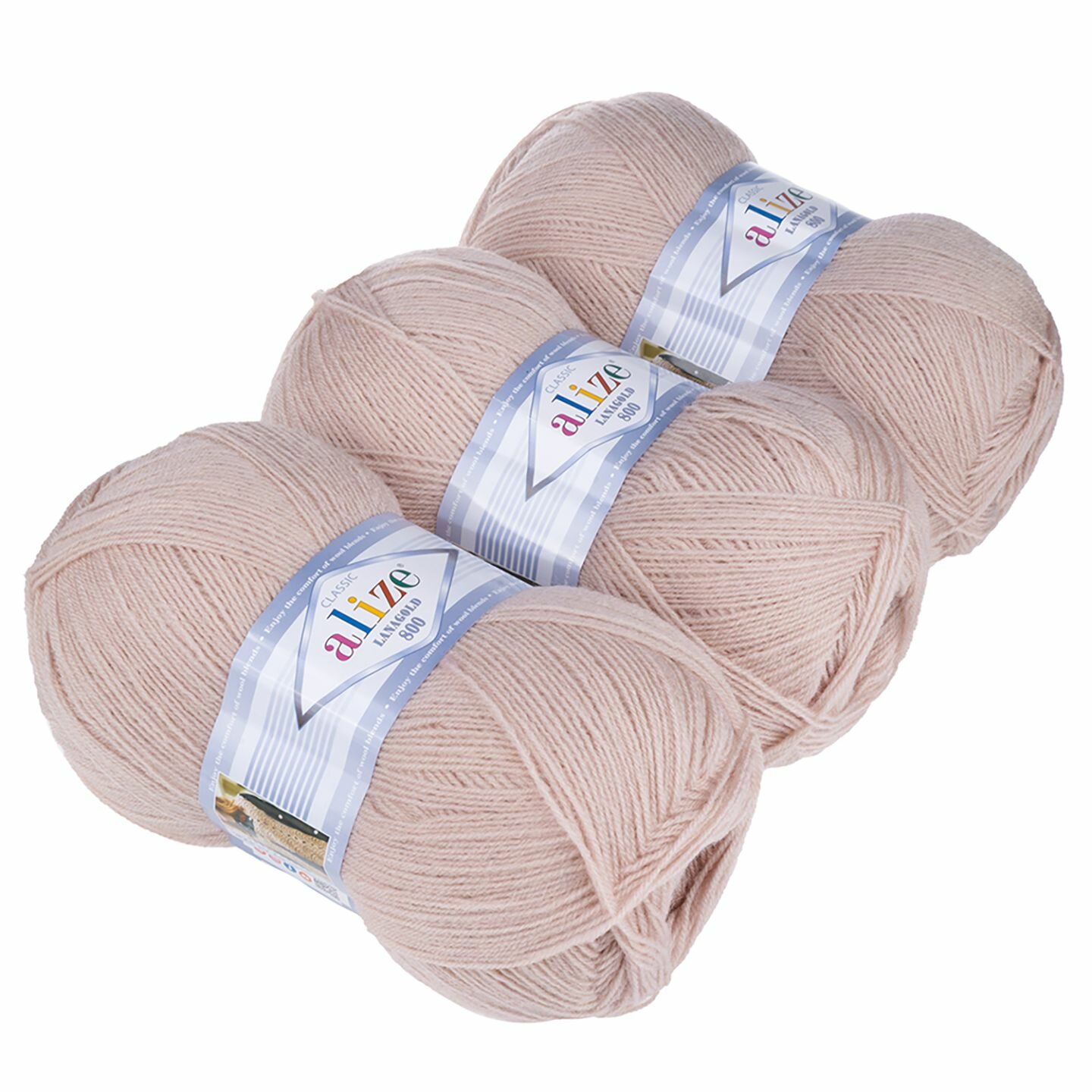 Пряжа ALIZE LANAGOLD 800, т. бежевый - 466, 49% шерсть, 51% акрил, 5 мотков, 100 г, 730 м.