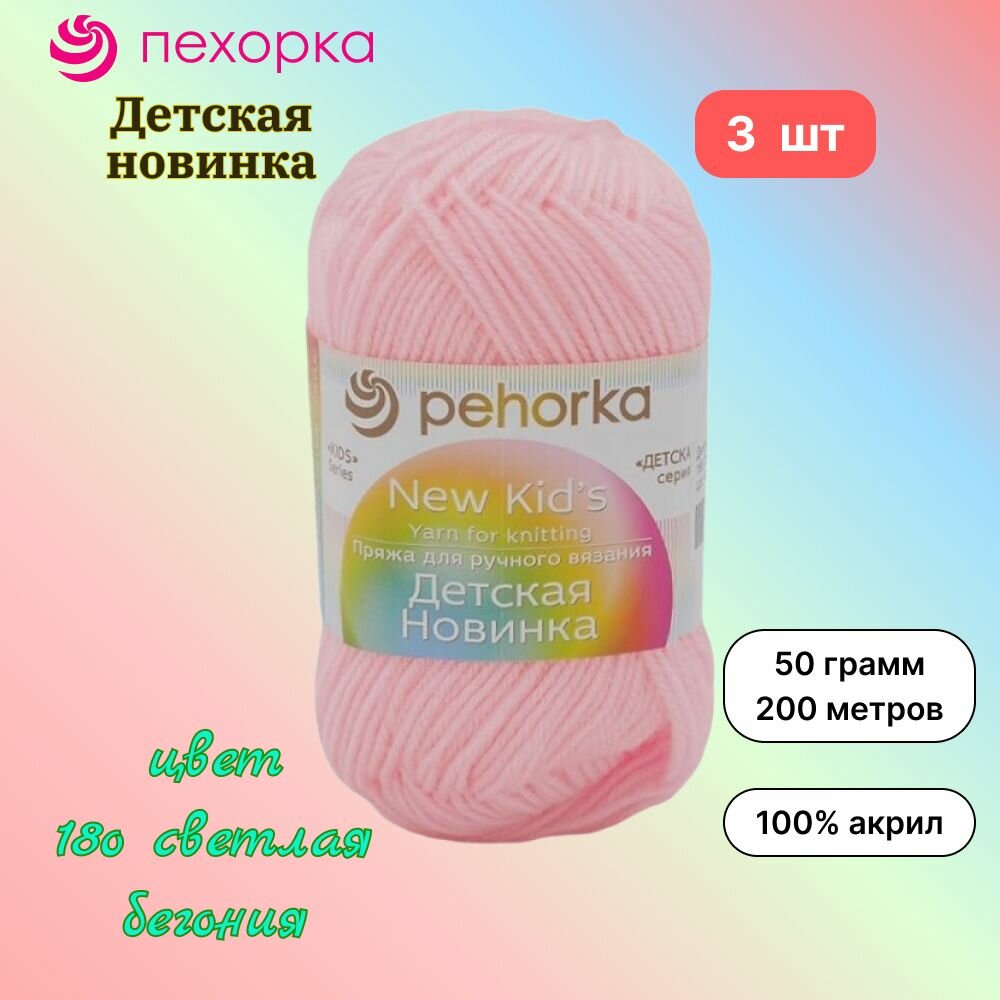 Пряжа Пехорка Детская новинка светлая бегония (180), 100%высокообъемный акрил, 200м, 50г, 3шт информация: