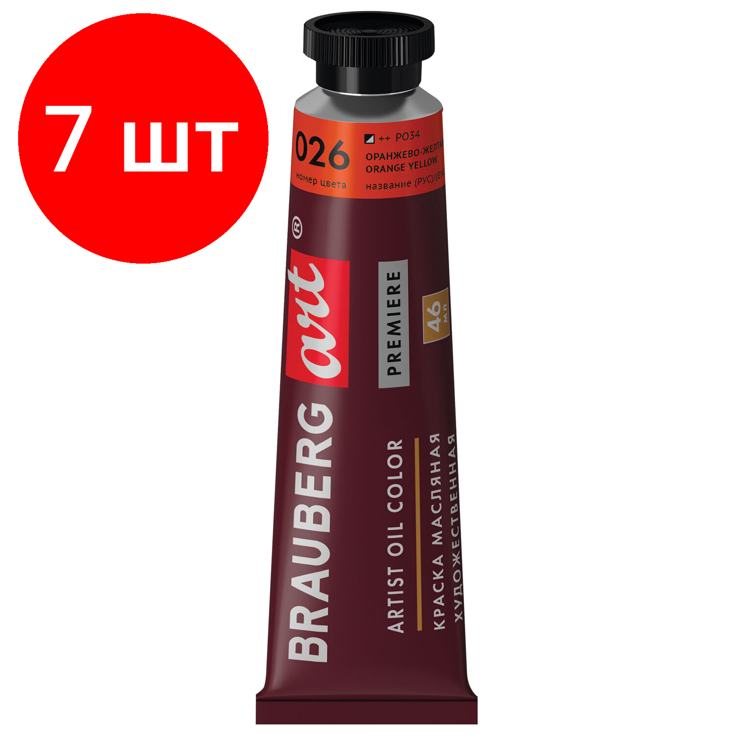 Комплект 7 шт, Краска масляная художественная BRAUBERG ART PREMIERE, 46 мл, проф. серия, оранжево-желтая, 191404 информация:
