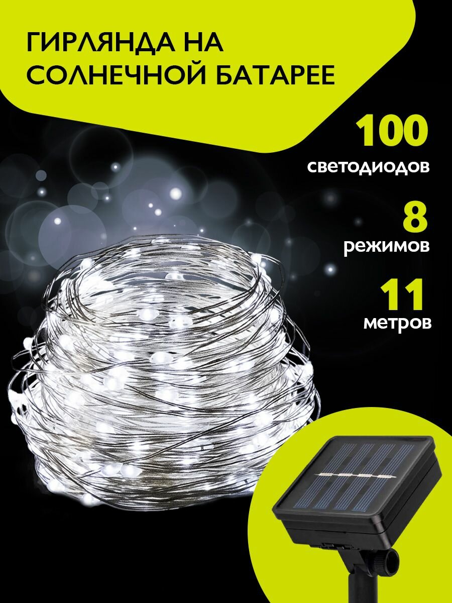 Гирлянда светодиодная 100LED 11,9м SLR-G03-100W нить холодный белый солн. батарея 8 режимов IP55 ФАZА