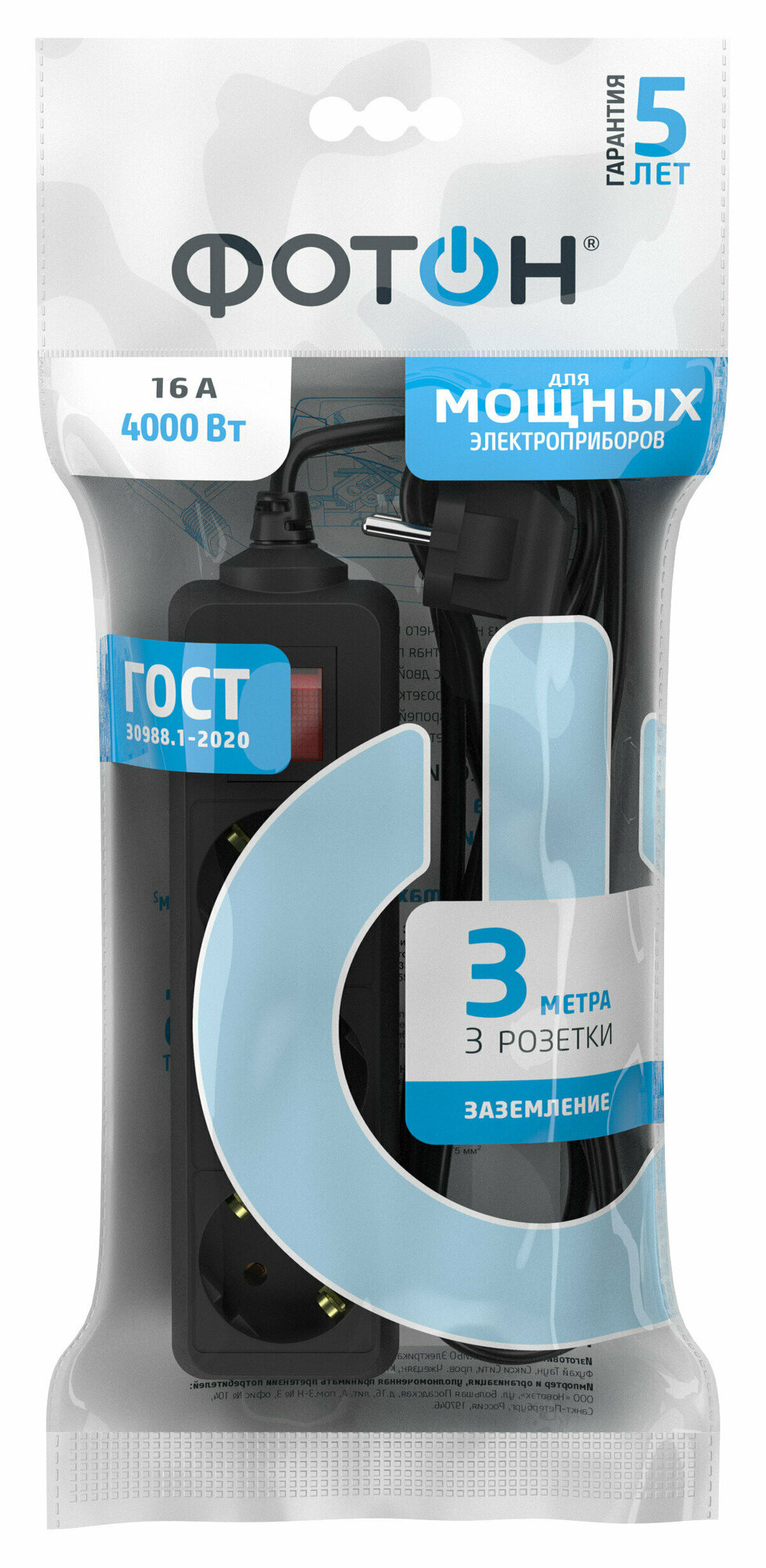 Удлинитель сетевой для розетки фотон 16А 3 метра 3 розетки с выключателем с заземлением черный, ГОСТ 999 ₽