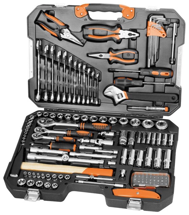 | Инструменты в комплекте | молоток / отвёртки / рукоять для бит / вороток для головок / трещотка / пассатижи / ключи гаечные / ключ разводной / ключи имбусовые (шестигранные) |