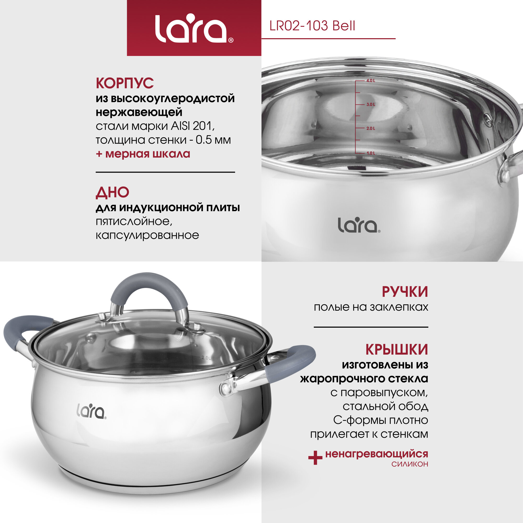 Набор посуды 5 предметов / Lara LR02-103 Bell / Кастрюля 2,7 л / Кастрюля 4,7 л / Чайник 2,5 л / серебристый