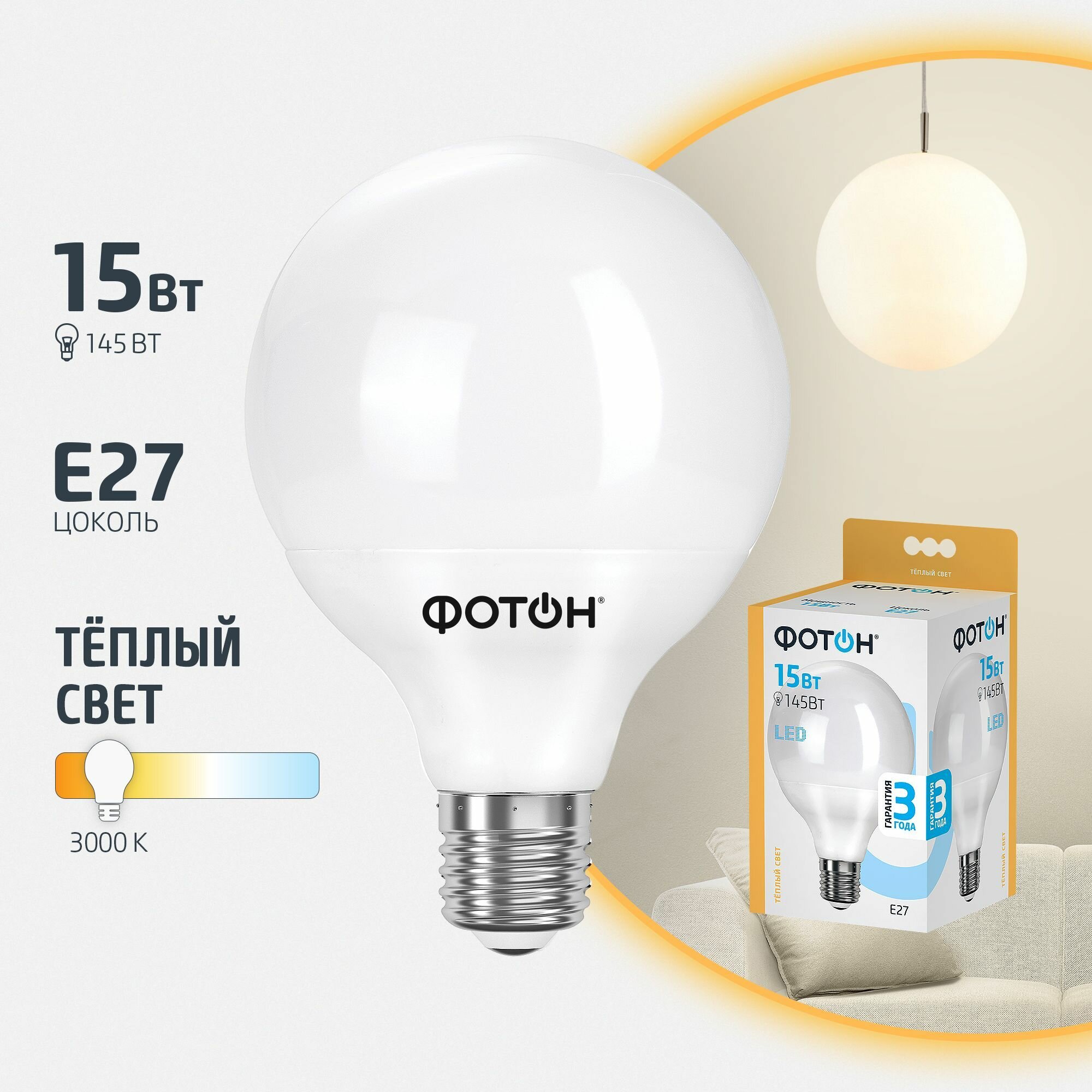 Фотон Лампа светодиодная LED G95 15W E27 3000K 23948
