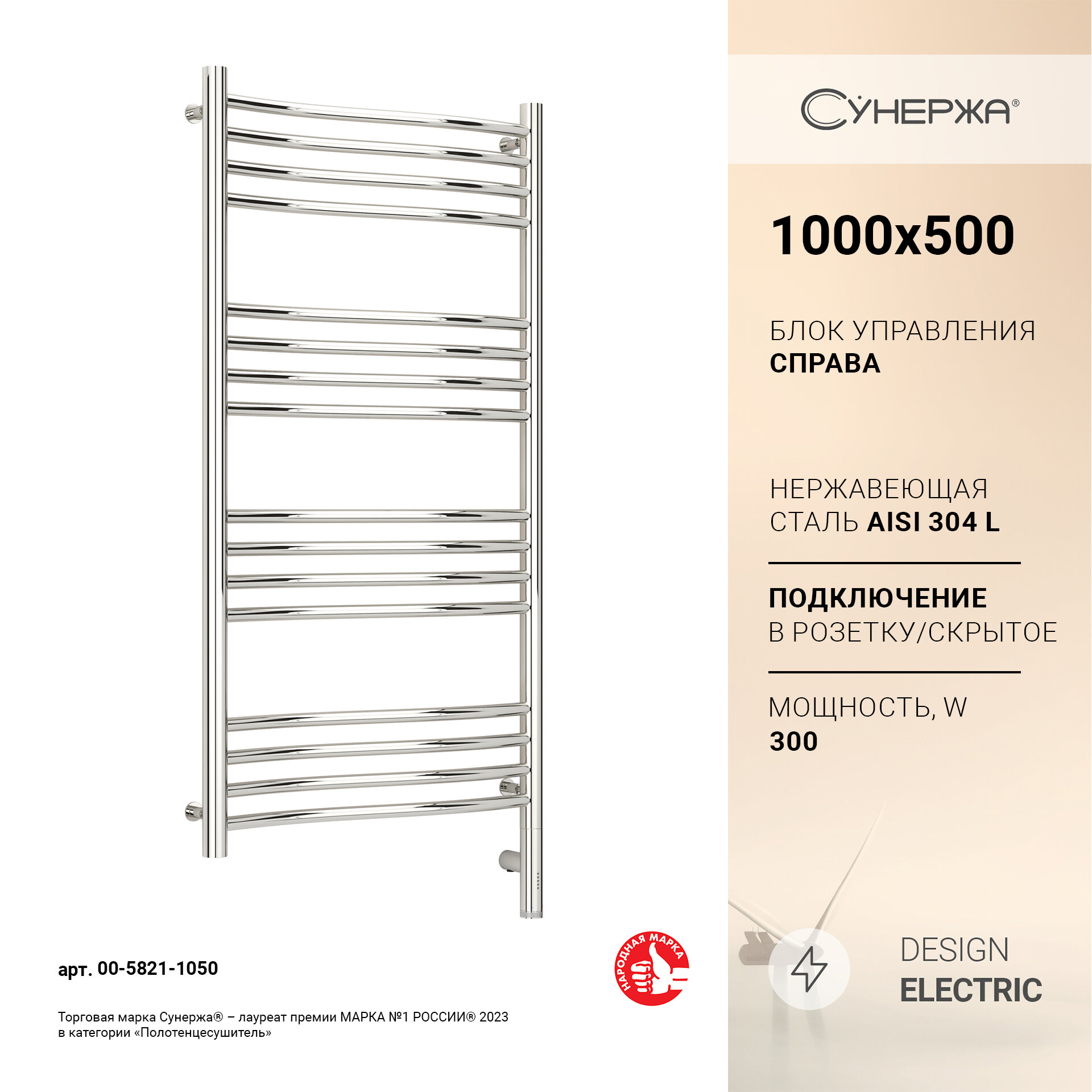Полотенцесушитель электрический Сунержа Флюид 3.0 1000х500 МЭМ правый Шампань