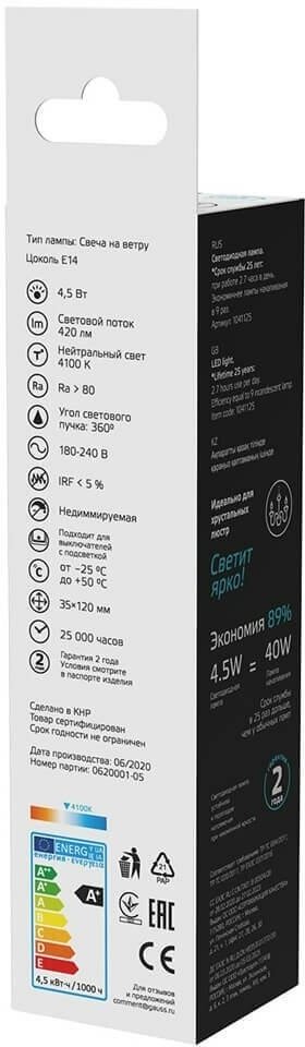 Светодиодная лампа Gauss Basic Filament Свеча на ветру 4,5W 420lm 4100К Е14 LED (10шт) информация: