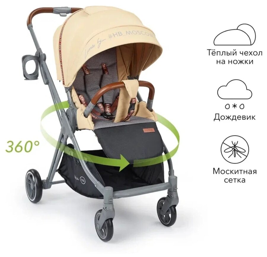 Коляска прогулочная зимняя детская Happy Baby LUNA, всесезонная, съемный бампер, капюшон, дождевик, москитная сетка, бежевая