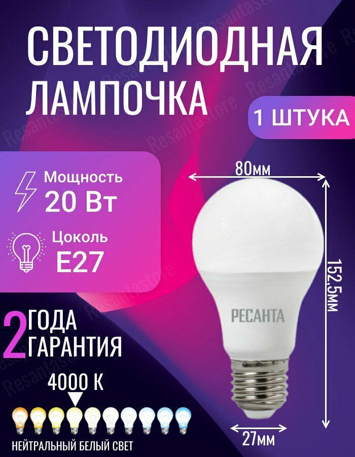Отзывы на Светодиодная лампа Ресанта LL-R-A80-20W-230-4K-E27 (груша, 20Вт, нейтр., Е27) 76/1/22
