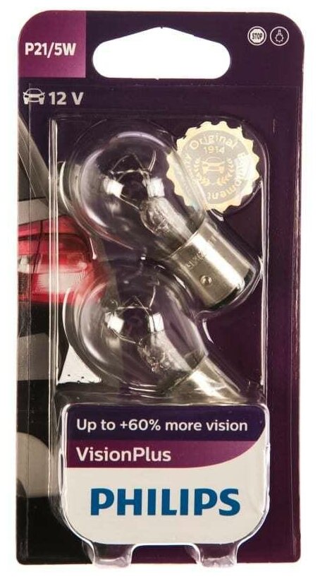PHILIPS 12499VPB2 Комплект ламп накаливания блистер 2шт P21/5W 12V 21/5W BAY15D VISIONPLUS (На 60% больше света на дороге, стоп-сигналы видно раньше из-за более мощного света)