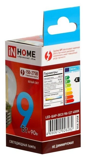 Отзывы на INhome Лампа светодиодная IN HOME LED-ШАР-deco, 9 Вт, 230 В, Е27, 4000 К, 1040 Лм, прозрачная