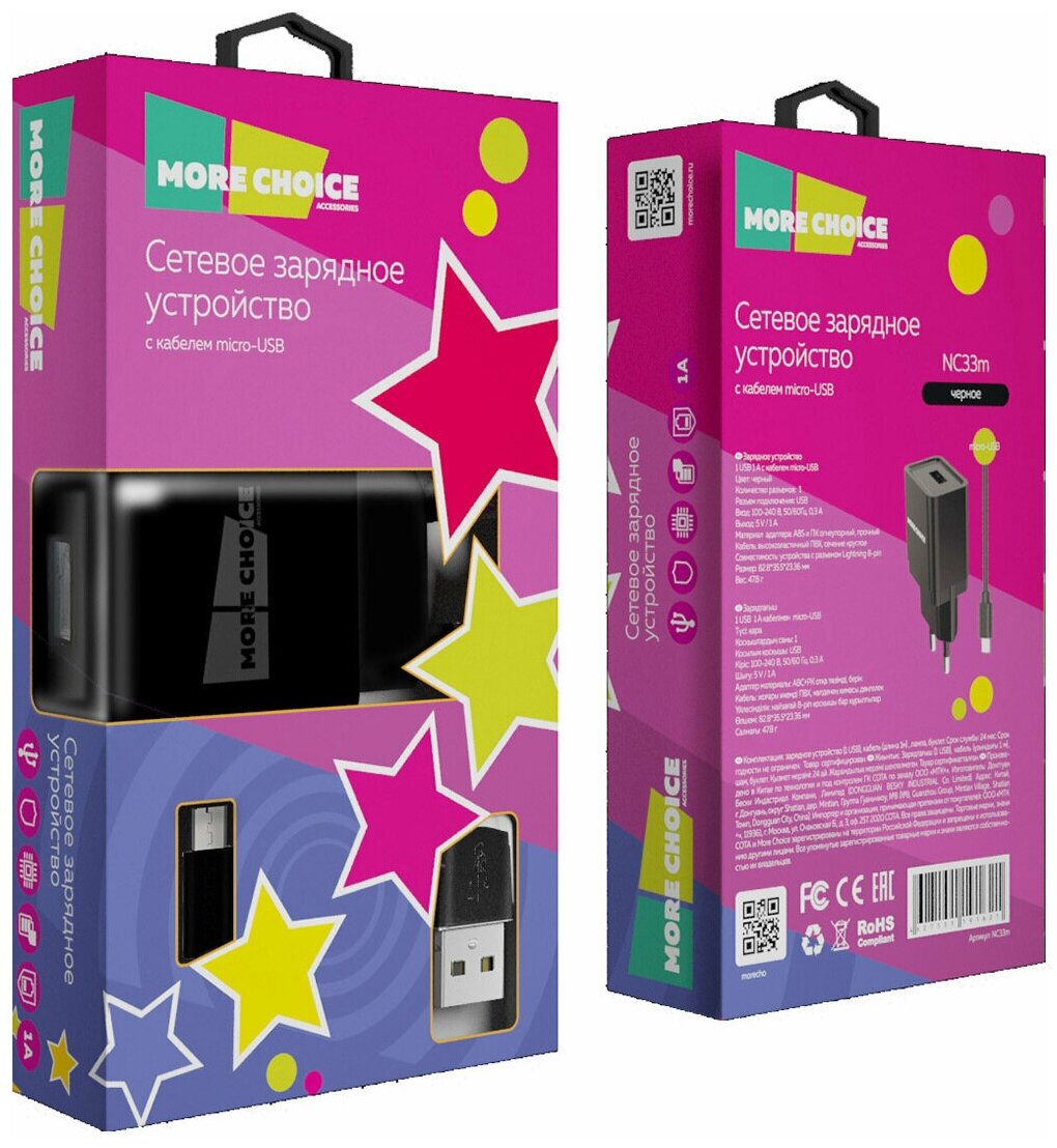 More Choice (4627151191621) NC33m СЗУ 1USB 1A micro USB Black 1m .
