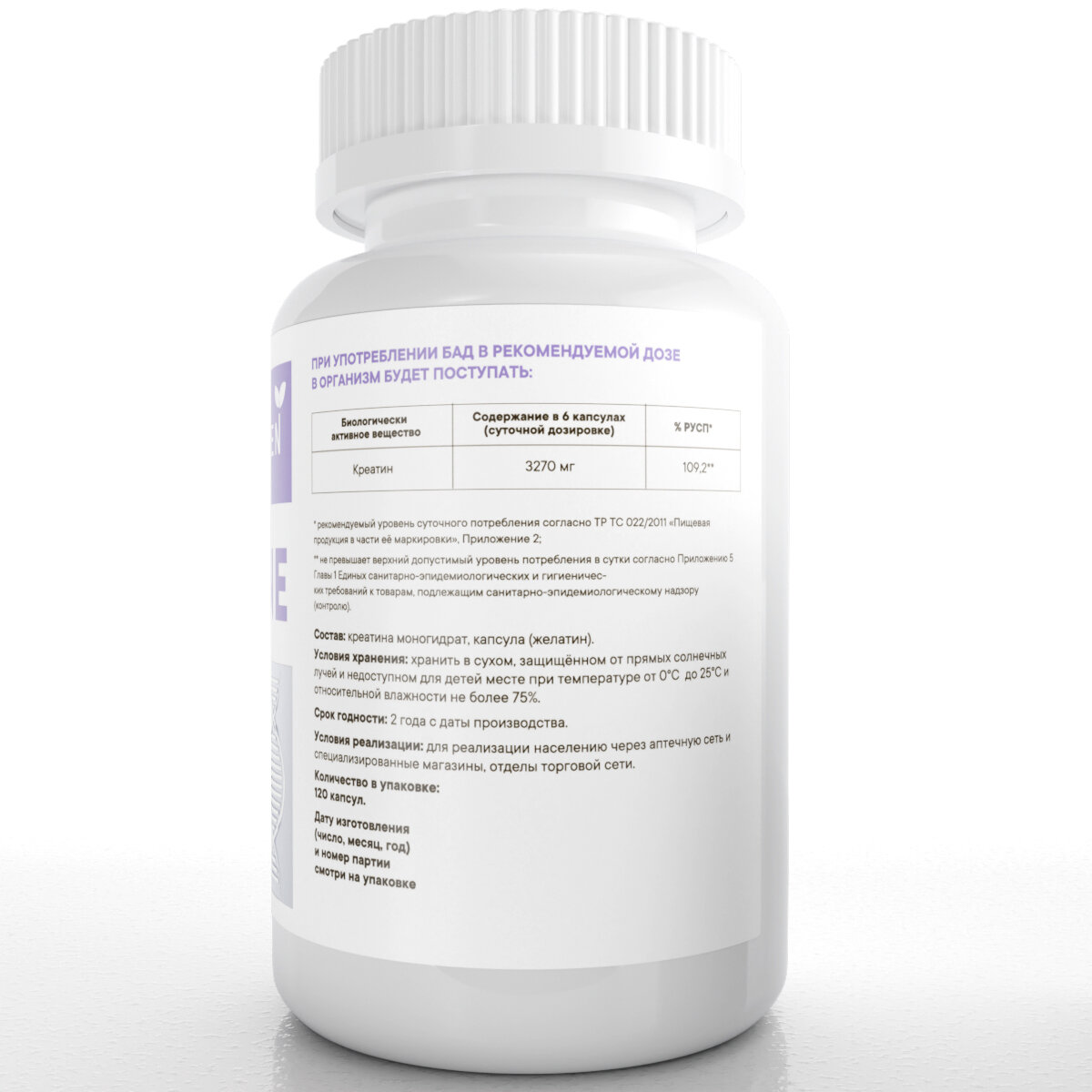 | Дополнительная информация | для получения лучшего эффекта следует принимать БАД под присмотром диетолога и тренера; размер порции: 6 шт.; рекомендации по применению: взрослым по 6 капсул в день, продолжительность приема 1 месяц; состав: креатина моногидрат (Creatine Monohydrate), кремния диоксид (антислеживающий агент), капсула (желатин). |
