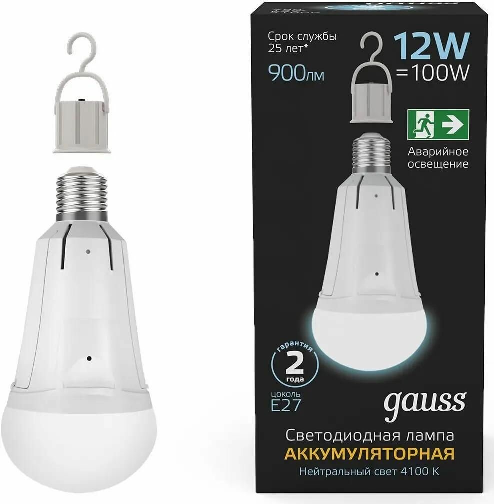 Gauss Лампа светодиодная 12Вт A80 4100К нейтр. бел. E27 900лм аварийная Li-Ion аккум. GAUSS 102002212