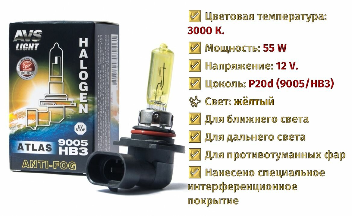 Галогенная лампа AVS ATLAS ANTI-FOG BOX желтый HB3/9005.12V.55W.коробка 1шт. информация: