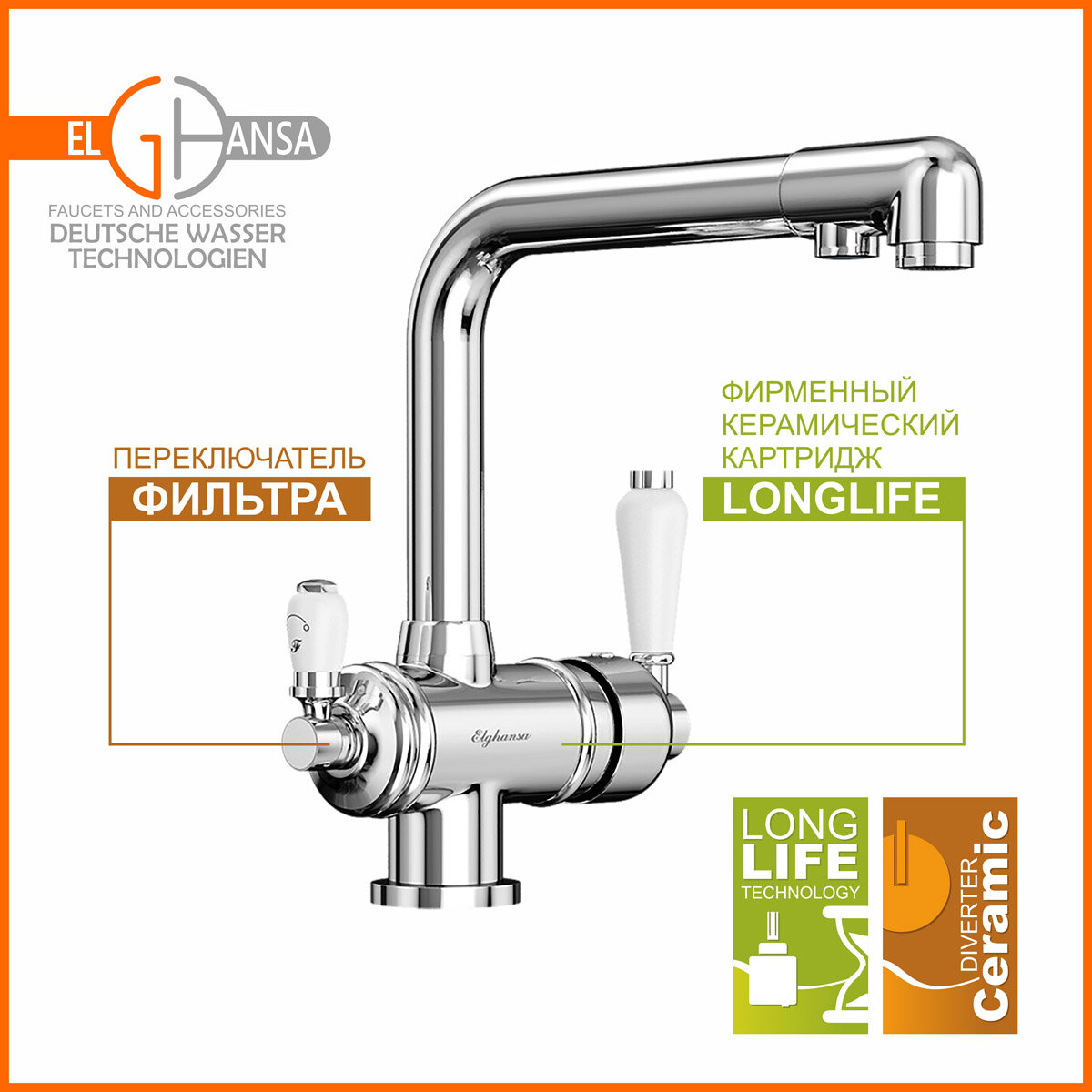 Смеситель для кухни (под фильтр) для питьевой воды, латунный однорычажный Elghansa KITCHEN Pure Water 56A5740, цвет хром информация: