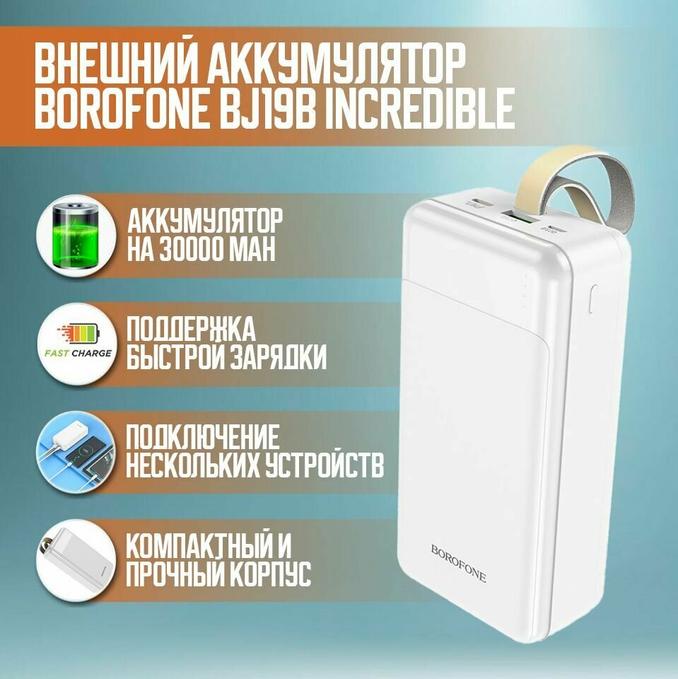 Внешний аккумулятор Borofone BJ19B Incredible, белый (30000mAh, 1xUSB/1xUSB-C QC3.0&PD, 3A 20W) информация: