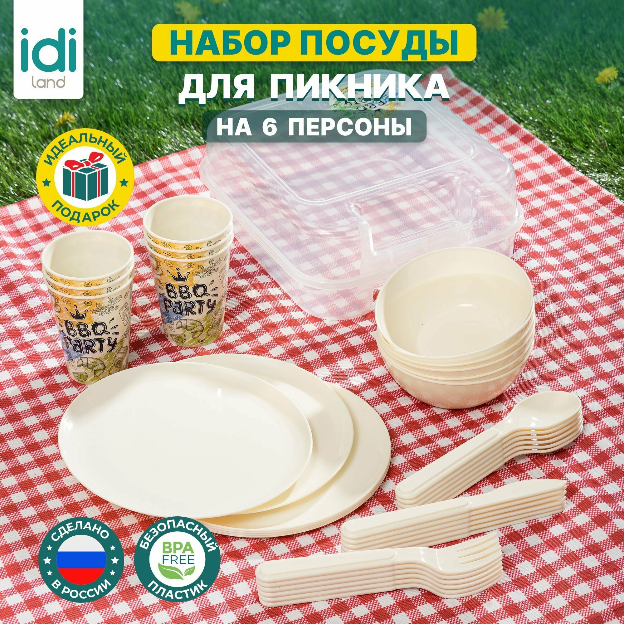 | Комплектация | Набор для пикника состоит из 37 предметов: контейнер для набора - 1шт., тарелка 20см - 6шт., миска 13см - 6шт., стакан с декором 280мл - 6шт., вилка - 6шт., нож - 6шт., ложка - 6шт. |