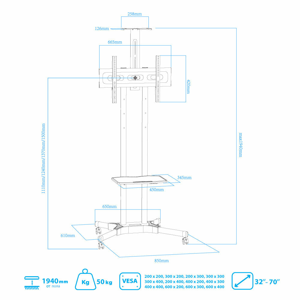Стойка на колесах Arm media PT-STAND-12 черная для TV/LFD 32-70, полка, max VESA 600x400, высота 1110-1500 мм 8 296 ₽