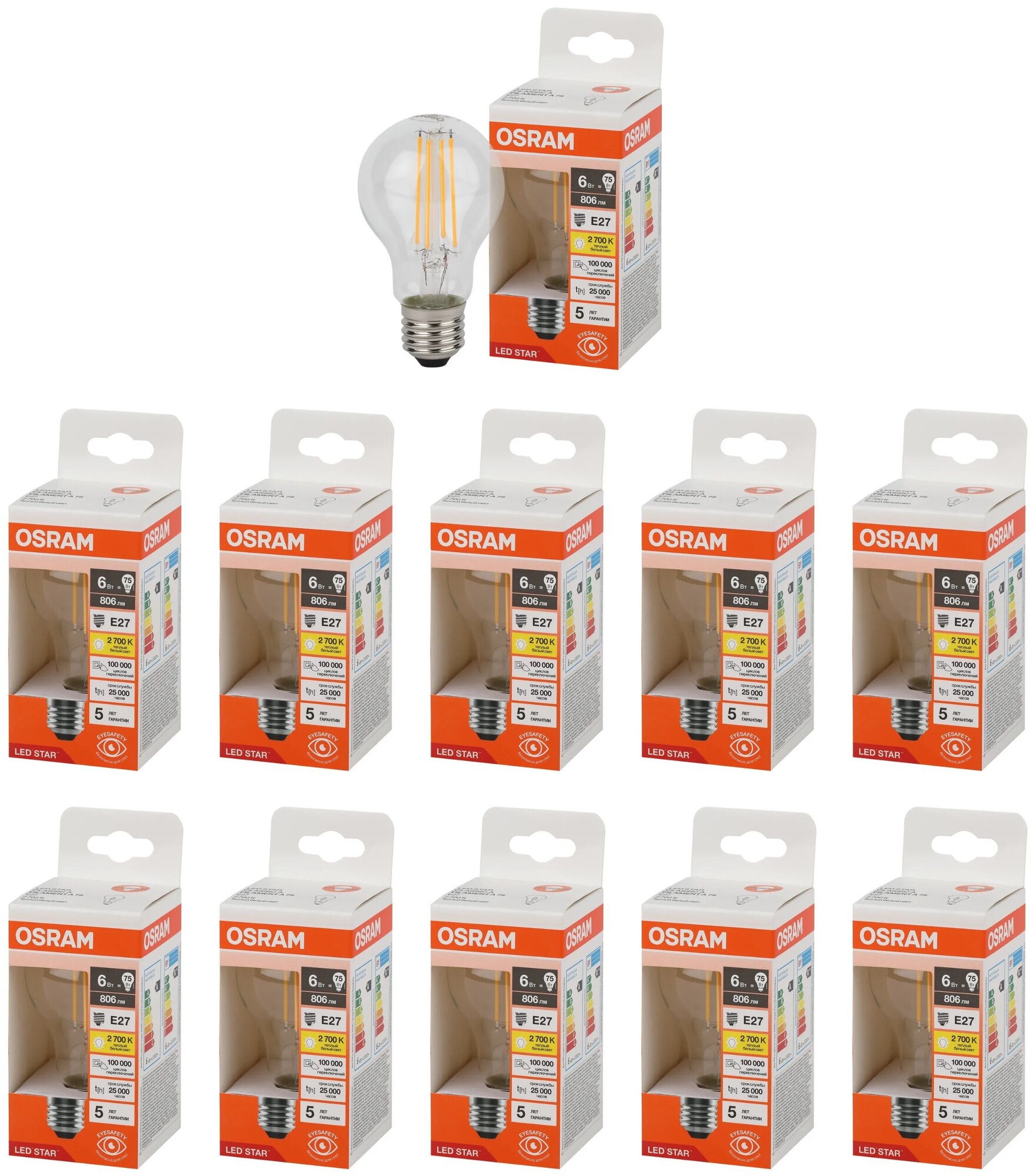 Отзывы на Лампа светодиодная OSRAM 6Вт Е27 Груша LED STAR CL A Филаментная Стекло 220В 2700К Теплый белый, уп. 10шт