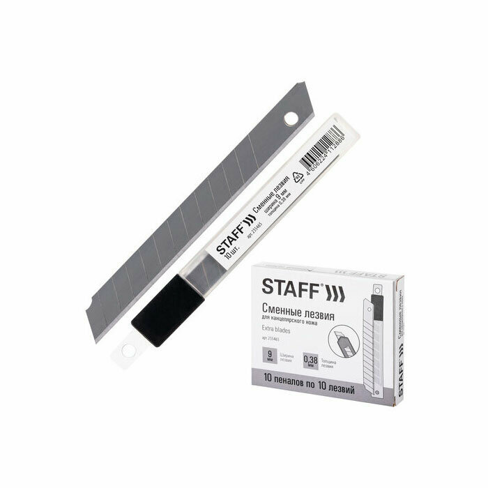 Лезвия для ножей 9 мм комплект 10 ШТ., толщина лезвия 0,38 мм, в пластиковом пенале, STAFF "Basic", 235465 упаковка 30 шт.
