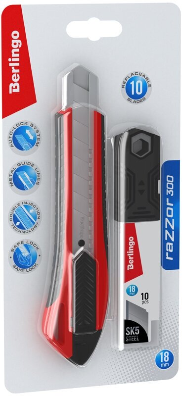 Нож канцелярский 18мм Berlingo "Razzor 300", красный + лезвия сменные 10шт., блистер, европодвес (арт. 341934)