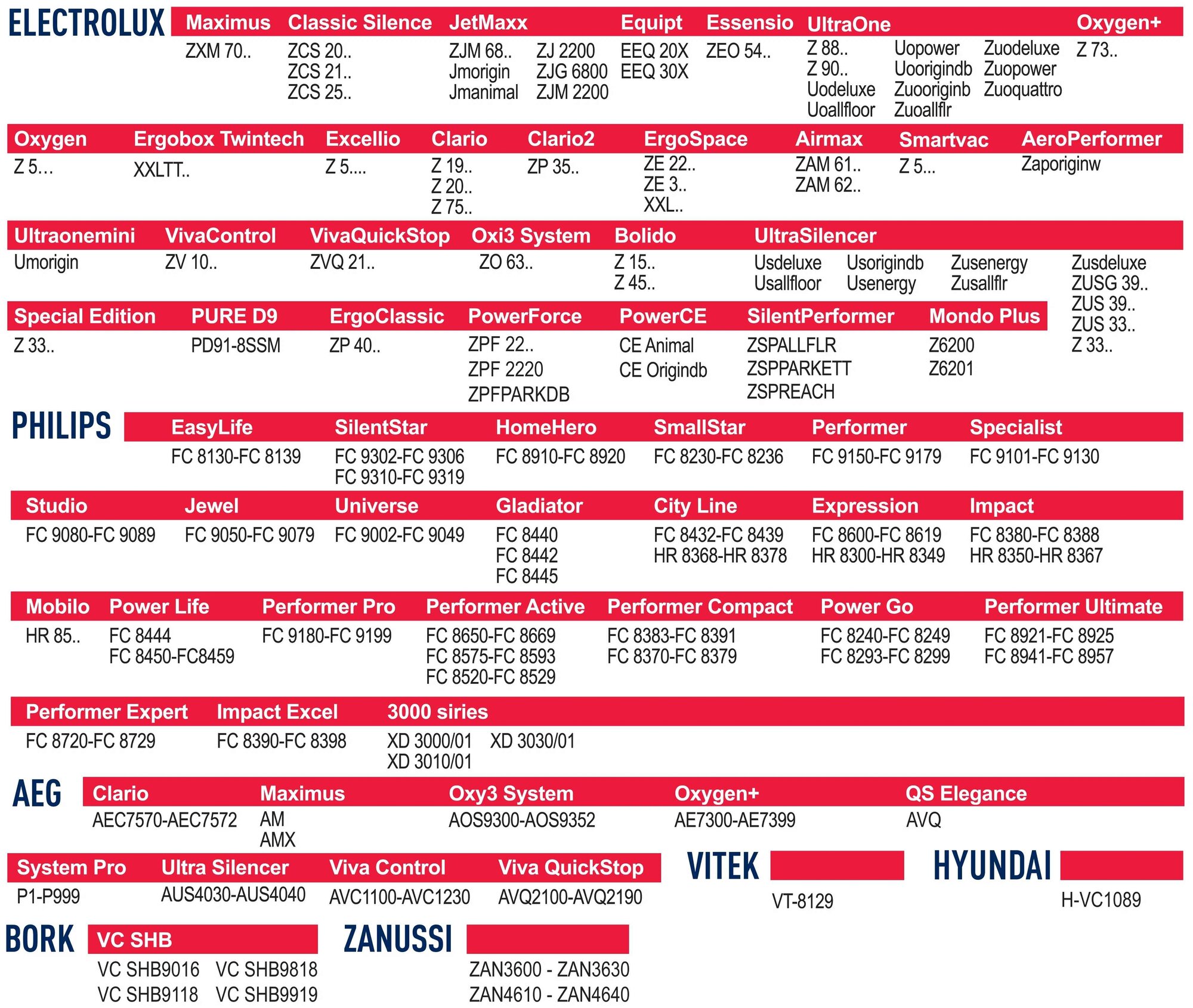 | Совместимые модели | ELECTROLUX: PURE D9: PD91-8SSM; 3000 series: XD3000/01, XD3010/01, XD3030/01; SilentPerformer Zspallflr, Zspparkett, Zspreach; AeroPerformer: Zaporiginw; ErgoClassic: ZP40..; PowerForce: ZPF22..; PowerCE: CE Animal, CE Origindb; Equipt: EEQ20X, EEQ30X; Maximus: ZXM70..; Classic Silence: ZCS2...; JetMaxx: Jmorigin, Jmanimal, ZJ2200, ZJG6800, ZJM2200, ZJM68..; Essensio; ZEO54..; UltraOne: Uodeluxe, Uoallfloor, Uopower, Uoorigindb, Zuooriginb, Zuoallflr, Zuodeluxe, Zuopower, Zuoquattro, Z88.., Z90; UltraSilencer: Usdeluxe, Usallfloor, Usorigindb, Usenergy, Zusenergy, Zusallflr, Zusdeluxe, ZUSG39.., ZUS39.., ZUS33.., Z33..; Special Edition: Z33..; Ergobox Twintech: XXLTT..; Clario: Z19.., Z20.., Z75..; Clario2: ZP35..; ErgoSpace: ZE22.., ZE3.., XXL..; Airmax: ZAM61.., ZAM62..; Excellio: Z5....; Smartvac: Z5...; VivaControl: ZV10..; VivaQuickStop; Oxygen+: Z73..; Oxygen: Z5…; Oxi3 System: ZO63..; Bolido: Z15.., Z45..; Ultraonemini: Umorigin PHILIPS: PowerGo FC8240-FC8249, FC8293-FC8299; Performer Expert |