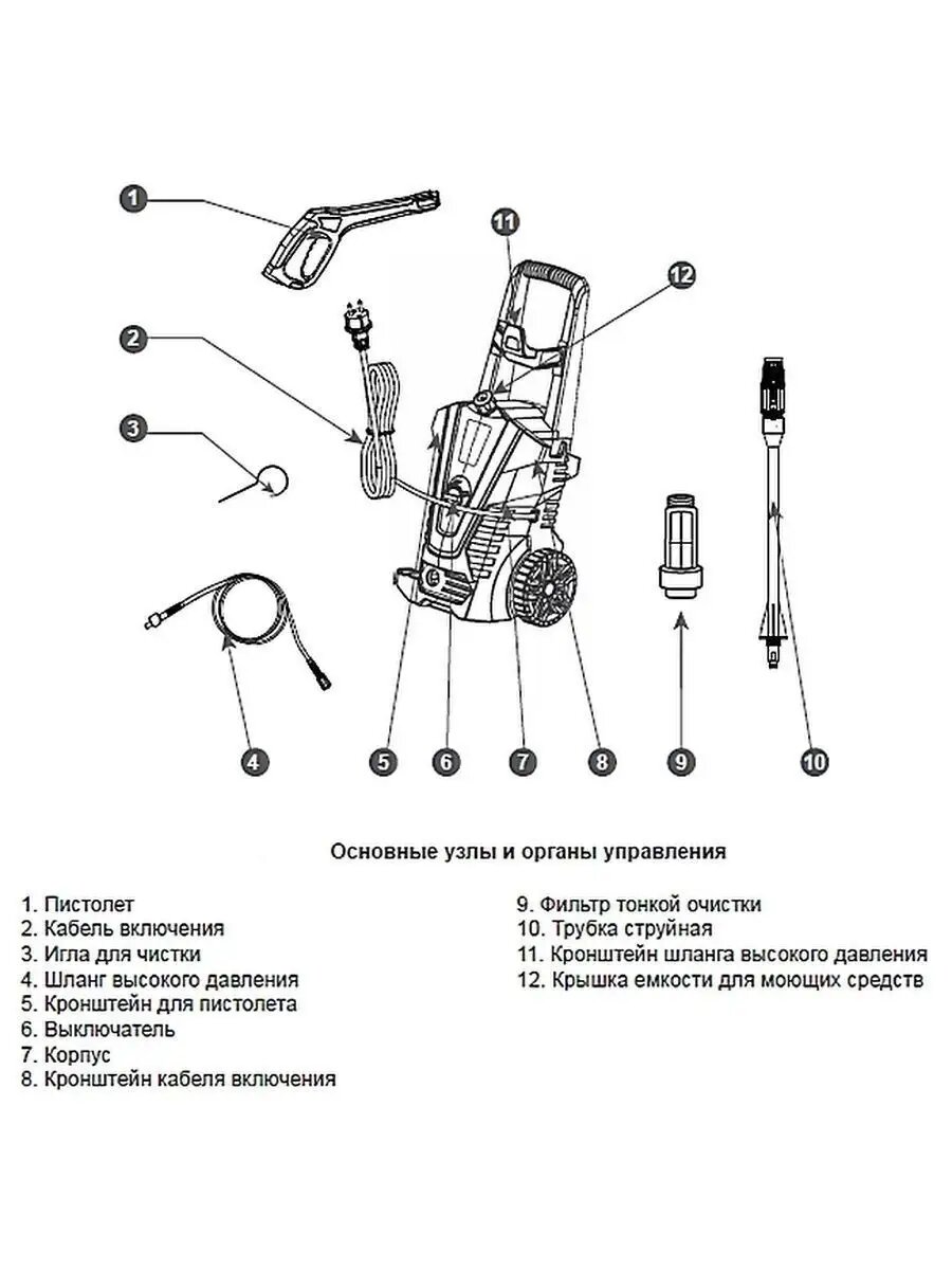 | Подробная комплектация | Мойка; Шланг высокого давления; Пистолет; Струйная трубка; Кронштейны для кабеля включения и шланга высокого давления (2 шт.); Игла для чистки форсунки струйной трубки; Фильтр тонкой очистки; Руководство по эксплуатации; Коробка. |