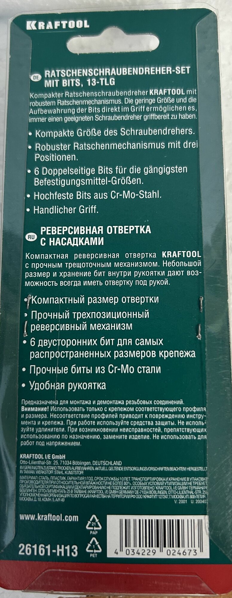 Отвертка реверсивная с двусторонними битами KRAFTOOL 12-в-1 информация: