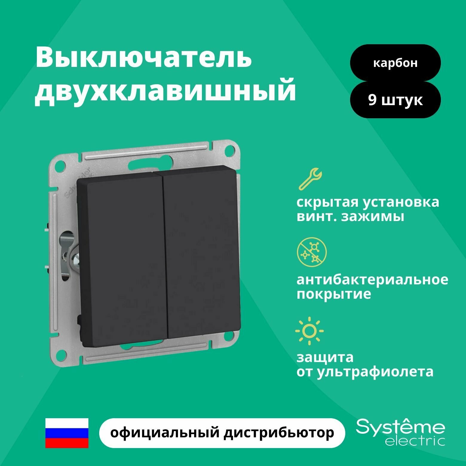Выключатель 2-клавишный ATLASDESIGN, скрытый монтаж, карбон. ATN001051 Schneider Electric (9шт.) информация: