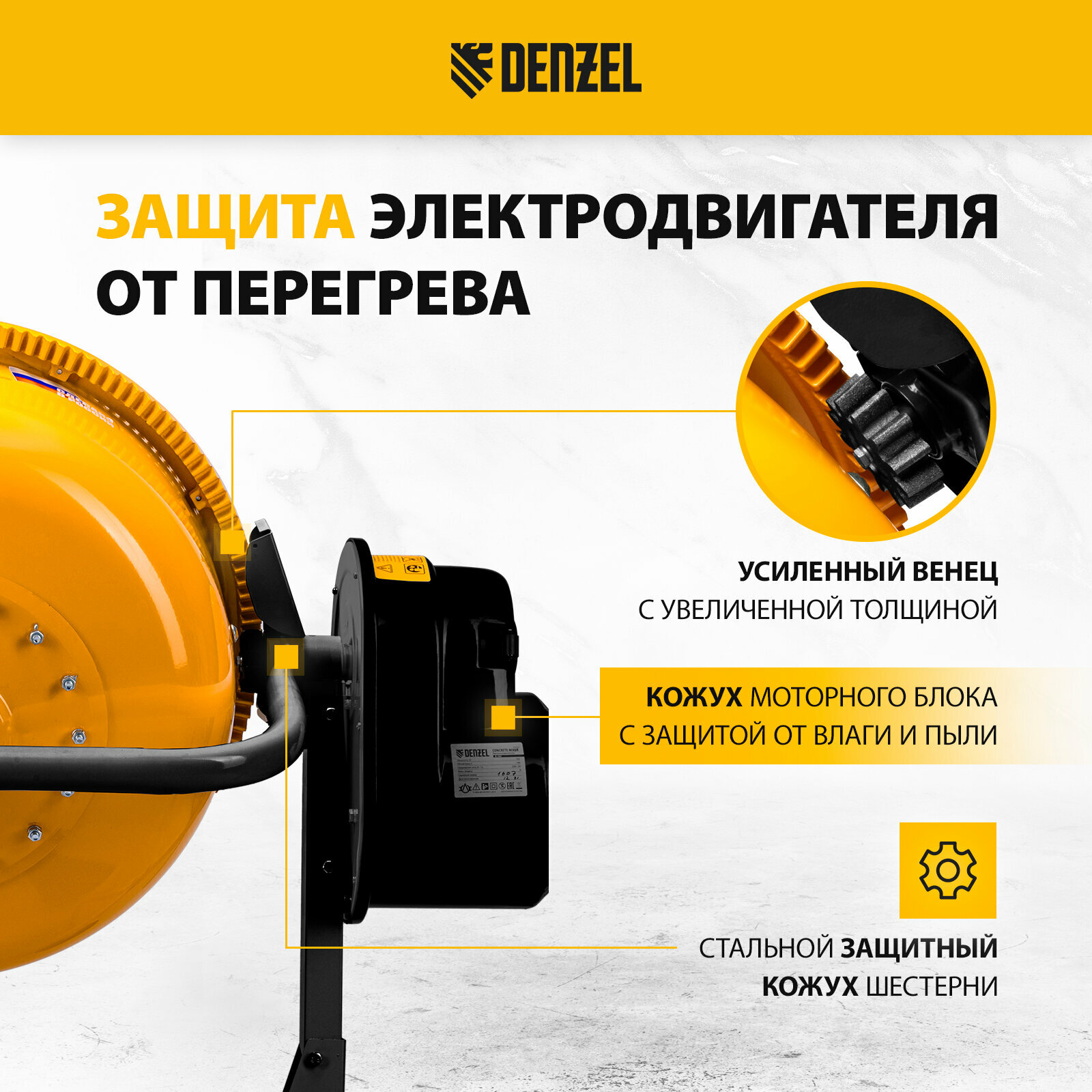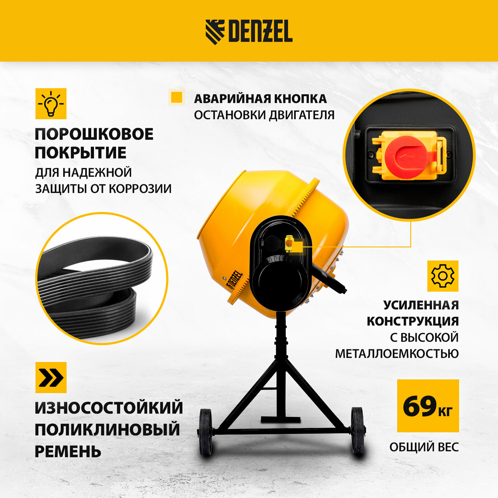 Бетономешалка DENZEL, B-200, 200 л, 1000 Вт, чугунный венец и стальная втулка, кнопка экстренного выключения, регулировка наклона барабана, II класс защиты, защита от перегрева и коррозии, IP44, 95424