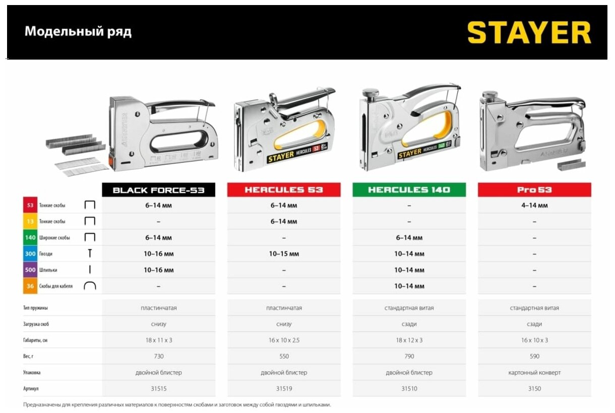 Stayer Стальной рессорный степлер тип 53(4-14мм)/13/300, STAYER HERCULES-53 информация: