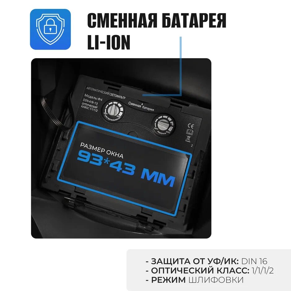 Маска сварочная хамелеон / маска сварщика ELECTROLITE Ф4 (9 DIN -13 DIN, смотровое окно 90*35 мм, ударопрочный пластик, автоматическое затемнение, солнечная батарея + АКБ) информация:
