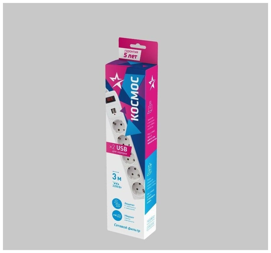 Отзывы на Сетевой фильтр космос 3м 5 гнезд, пвс 3x0,75мм2, белый 2 USB FKsm3m-5g(W)USB