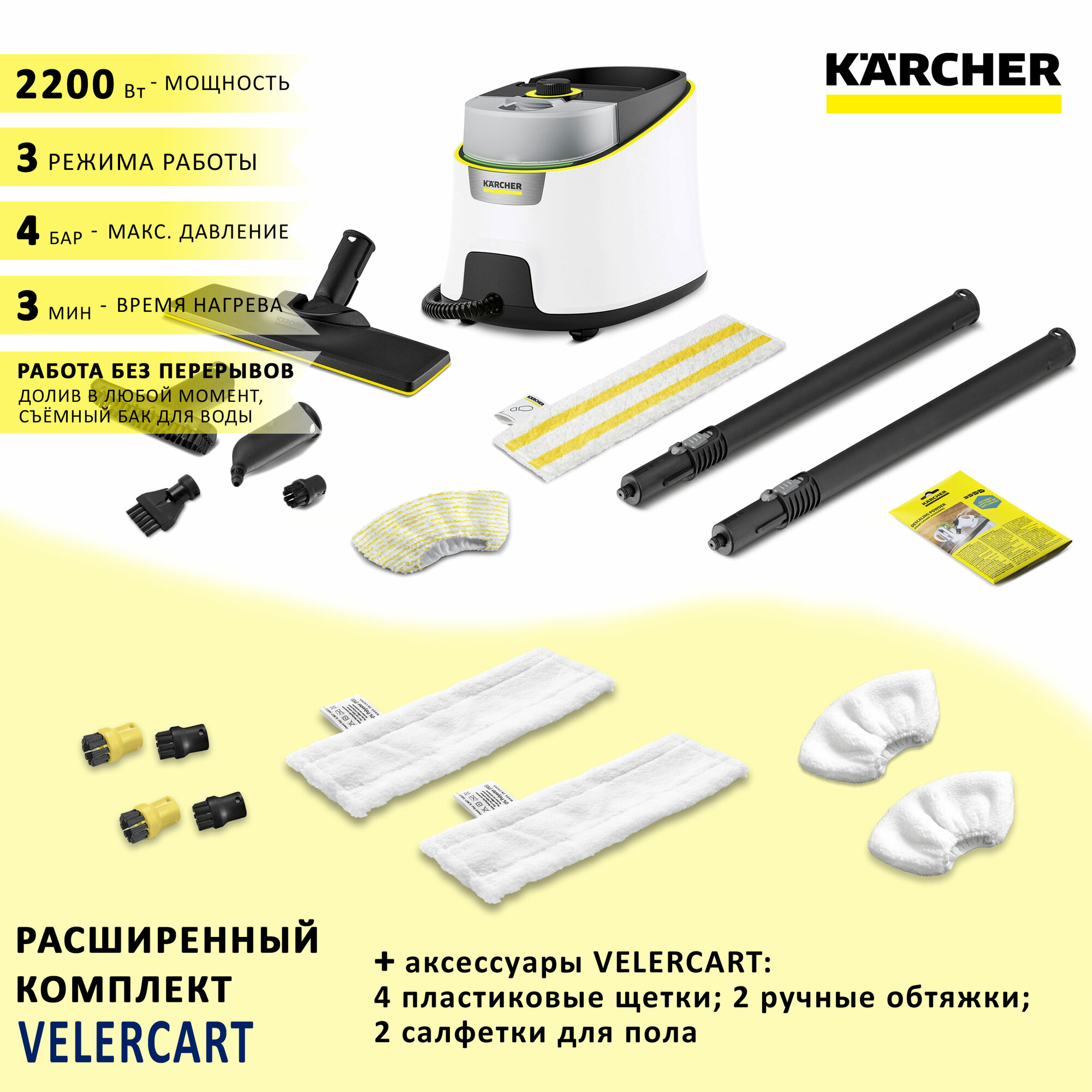 Отзывы на Пароочиститель для дома Karcher SC 4 Delux EasyFix, белый + аксессуары VELERCART: 2 салфетки для пола, 2 обтяжки для ручной насадки, 4 щёточки