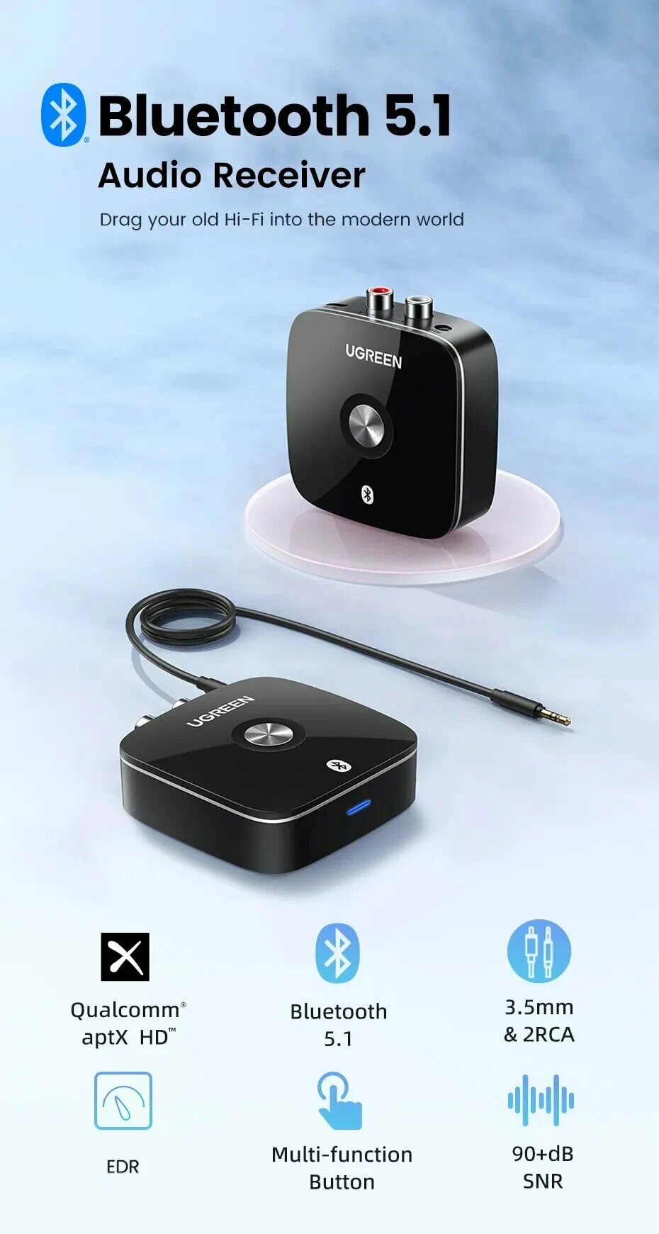 Bluetooth ресивер Ugreen адаптер с поддержкой aptX HD, Bluetooth 5.1, RCA, AUX информация: