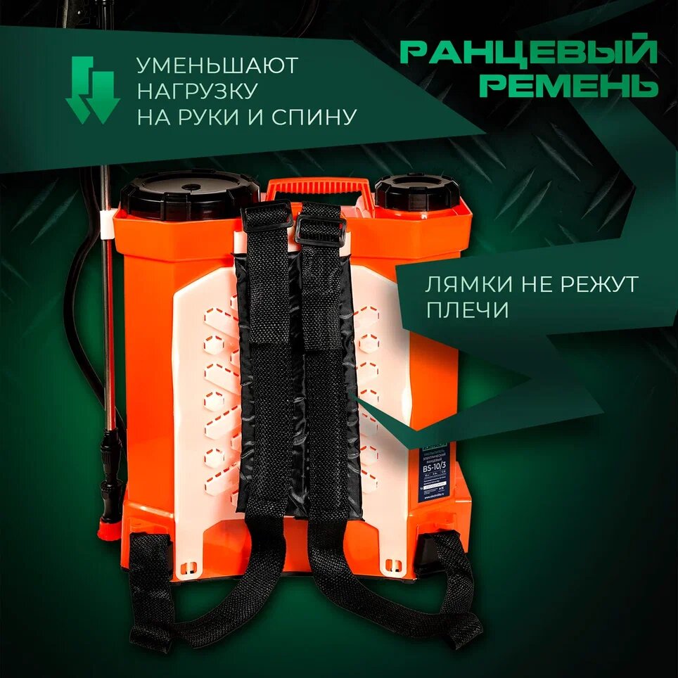 Опрыскиватель аккумуляторный садовый ранцевый для полива и обработки огорода, деревьев и растений ELECTROLITE BS-10/3 ( 10 л, 12 В, 8 А*ч, 3,6 л/мин, телескопическая трубка, 3 насадки ) информация: