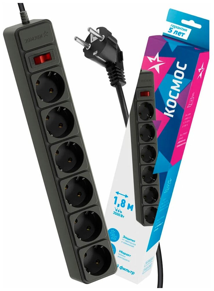 10 цен на Сетевой фильтр Космос 6 розеток, 1,8 м, пвс 3х0,75мм2, чёрный