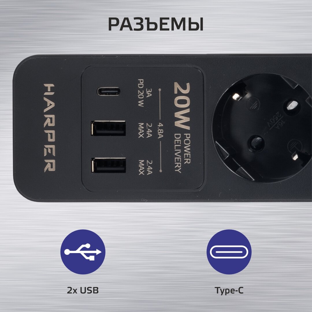 Сетевой фильтр Harper UCH-350 black PD3.0 (3 розетки, 2 USB-порта, 1 порт Type-C, 1,5 метра, шторки, встроенная защита от скачков напряжения и тока)