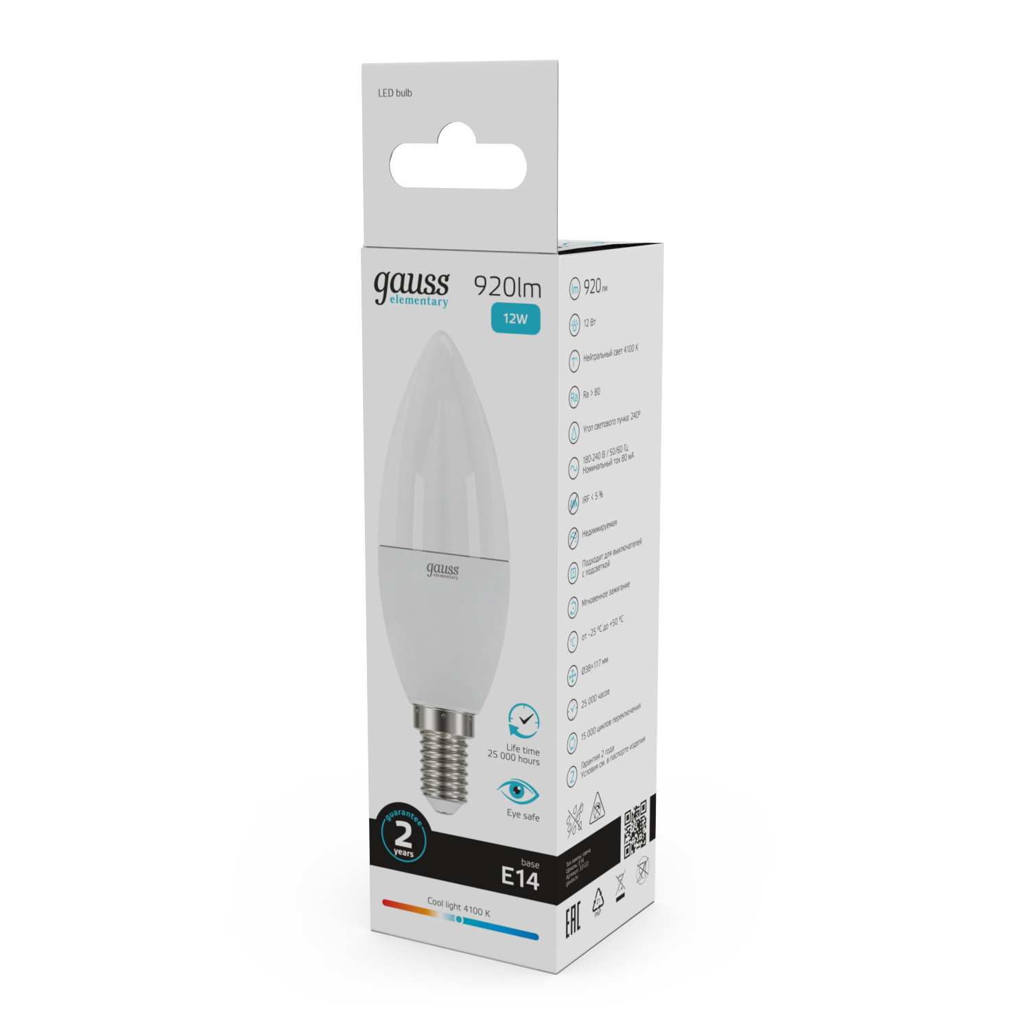Лампа светодиодная gauss 33122, E14, C37, 12 Вт, 4100 К информация: