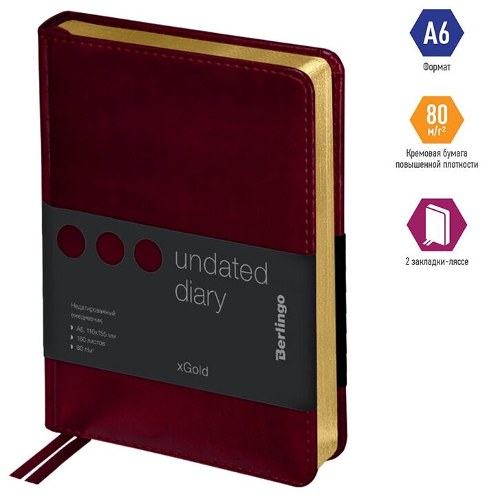 Ежедневник недатированный Berlingo A6, 160 листов, кожзам, "xGold", золотой срез, бордовый (UD0_81604)