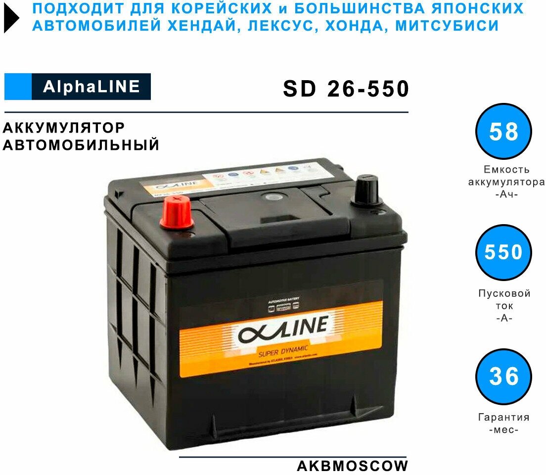 Автомобильный аккумулятор ALPHALINE SD 26-550 (12В 58Ач 550А 205х172х205) прямая полярность информация: