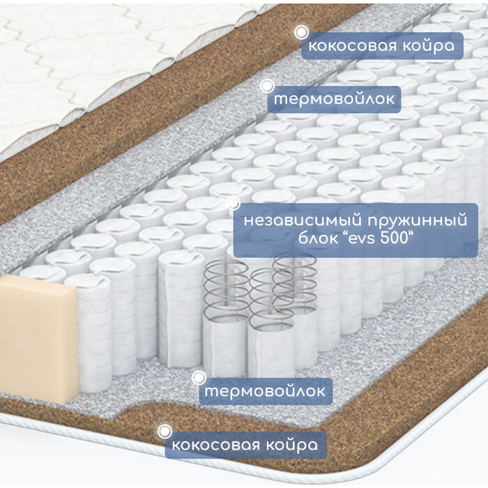 Матрас Капризун "Дрим Хард", коксовая койра 1 см с двух сторон, пружинный блок EVS 500, съемный белый чехол, 195х80х18 см 8 490 ₽