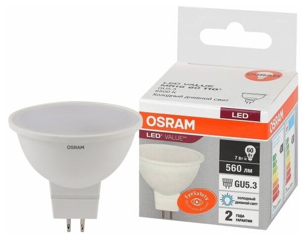 Отзывы на Лампа светодиодная OSRAM 7W=60W 220V Софит MR16 GU5.3 560Лм угол 110° 6500К Холодный белый, уп. 10шт