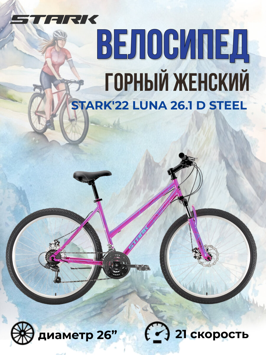 Женский горный велосипед с колесами 26" Stark'22 Luna 26.1 D Steel фиолетовый/голубой рама M (18") 21 скорость