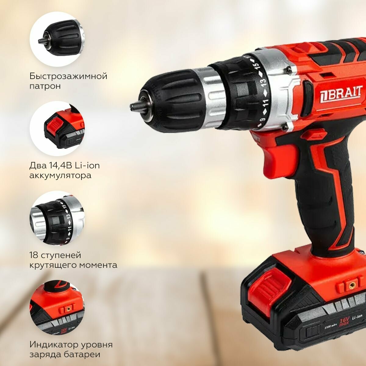 Дрель-шуруповерт BRAIT BCD16S От аккумулятора, 14,4В, 26Нм, 2АКБ, 450-1450 об/мин, подсветка, реверс, кейс информация: