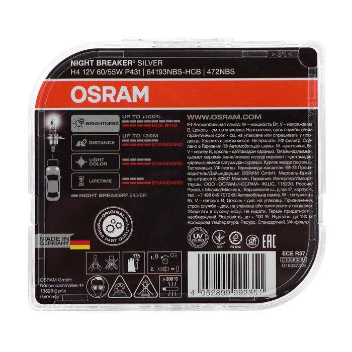 Отзывы на Лампа H4 12V 60/55W P43t н/о +100% NIGHT BREAKER SILVER (2 шт)